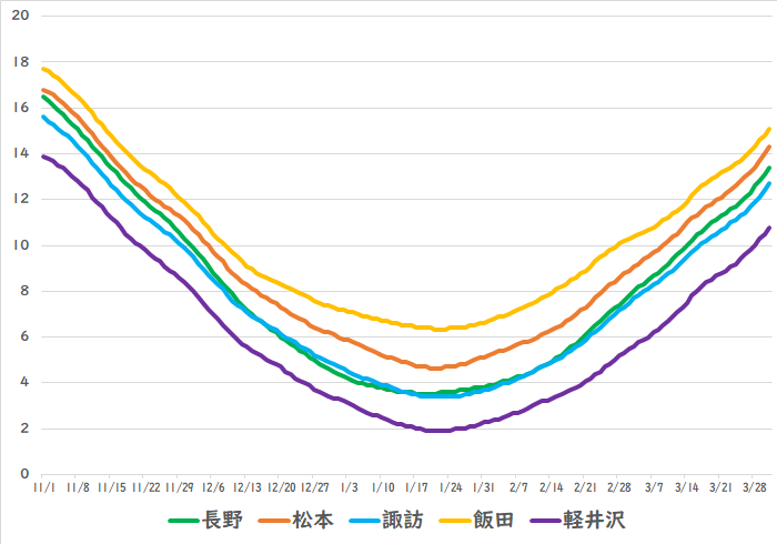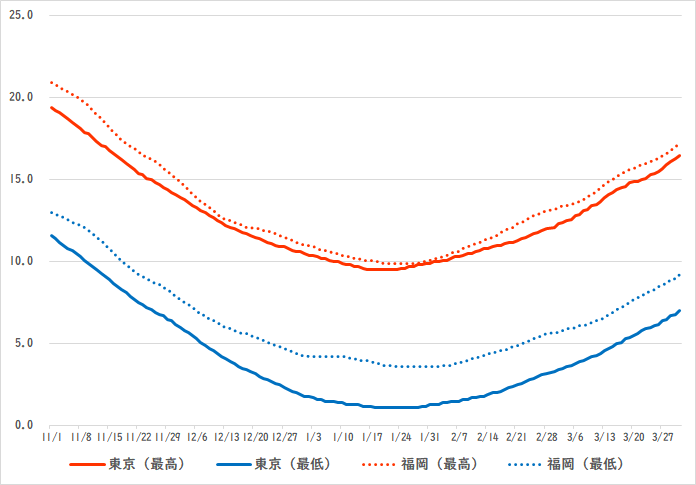 最高気温、最低気温とも冬シーズンを通して宇都宮(栃木)のほうが前橋(群馬)よりも低いのですが、最低気温のほうがその差が大きくなっています。それだけ、宇都宮のほうが朝晩の冷え込みが厳しいということになります。