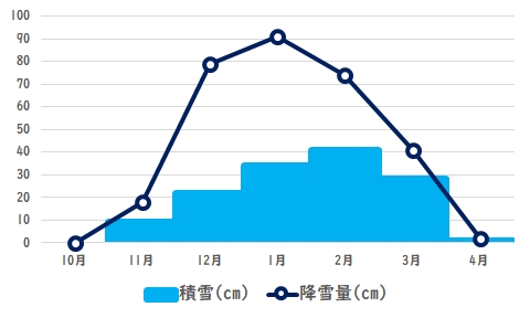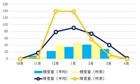 昨季は12月と1月の降雪量が平年よりもかなり多くなりました。12月は平年79cmに対し、昨季(2022年)12月は140cm。1月は平年91cmに対し、昨季(2023年)1月は139cmでした。