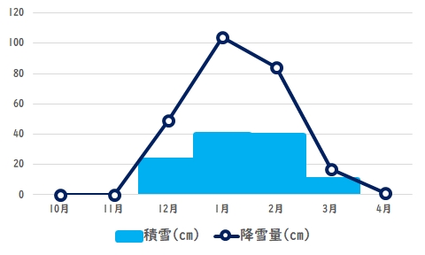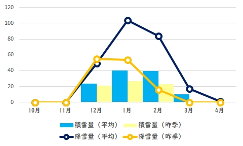 昨季は12月の降雪量が平年(76cm)の2倍以上172cmとかなりの大雪になりました。この影響で積雪量も12月と1月に1mを超えました。