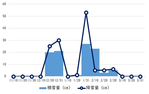 雪が降ったピークが12月と1月にあり、ここで積雪量も一気に増えました。